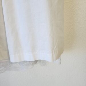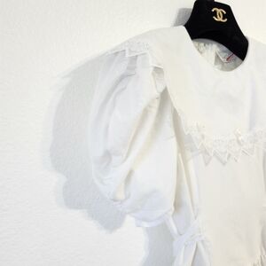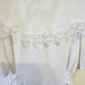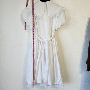 Elegant white dress with lace trim yoke collar, puff sleeves and a pricess waist with a built in lace hem crinoline petticoat. Perfect for special occasions.