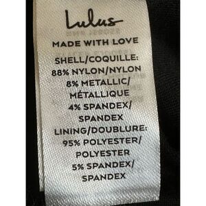 Turn heads at your next event with this stunning Lulus x Lulu’s black mini dress. This backless bodycon design hugs your curves in all the right places, while the shimmering metallic threads add a touch of glamour. Perfect for cocktail parties, upscale gatherings, or a night out on the town, this dress ensures you make a memorable entrance. Crafted from a blend of nylon, spandex, and polyester, it offers both comfort and style. Hand wash only to maintain its allure. This dress is pre-owned but in excellent condition.