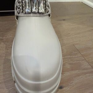 Stylish gray combat boots with crystal embellishments. Durable and trendy design.