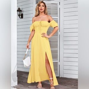 Romantic Off-Shoulder Ruched Maxi Dress in Sunshine Yellow