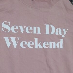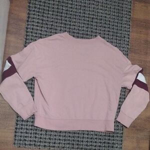 Cozy pink sweater with maroon and white sleeve stripes. Perfect for casual wear.