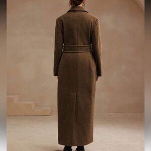 Brown long coat belted trench maxi coat minimalist tailored wool look winter coat luxe boutique outerwear longline silhouette structured collar clean lines quiet luxury capsule wardrobe timeless elegant streetwear chic city style modern feminine fall winter staple soft lining polished elevated everyday coat Parisian inspired office dinner travel layering cozy warm neutral earthy tone classic refined high end style runway inspired townhouse chic wool like