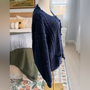 This awesome vintage cardigan sweater is super chunky and oversized in the best way. Navy blue marled yarn. It has a cool Babaa vibe. It’s in good condition, except for the second button hole is damaged. If you plan to wear it as an open cardigan or just button the top button, you wouldn’t notice! Size L/XL. Really cute and oversized on a size M. Pit to pit is 25”-ish.