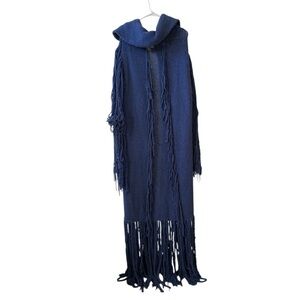 KHAITE Fringe Olwen Longline Knit Sleeveless Sweater Cardigan Blue. One size. Good preowned condition, fabric tag removed. Material: cashmere. Fringe style sleeves and bottom hem, collar, thick knit design, front pockets.