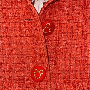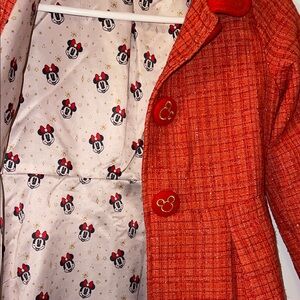 Stylish orange, reddish coat with a unique Minnie Mouse button. Features a playful inner Minnie, mouse silky lining.