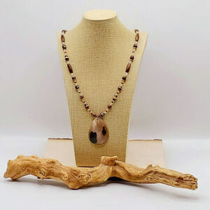 This necklace has a large abalone shell pendant with glass beads, wrapped paper beads and wooden beads. This necklace is long (29 inches), but very lightweight.