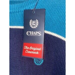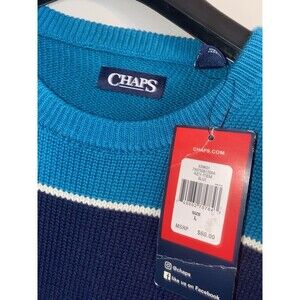 This product is a Chaps pull over sweater in size large, featuring a crew neckline and classic striped pattern in blue. The sweater is accented with an embroidered logo, adding a touch of style to the pullover design. Perfect for men looking for a comfortable and stylish sweater to add to their wardrobe, this Chaps sweater combines quality construction with a timeless look.