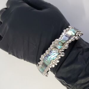 Description: This sterling silver ring features a mesmerizing Larimar gemstone as its focal point, radiating the tranquil blues and swirling whites of a serene Caribbean sea. The beautifully polished cabochon Larimar stone is set in a wide, ornately designed sterling silver band that exudes vintage charm and artisanal craftsmanship. Intricate filigree work wraps around the band, showcasing delicate, nature-inspired details that complement the ethereal beauty of the Larimar.