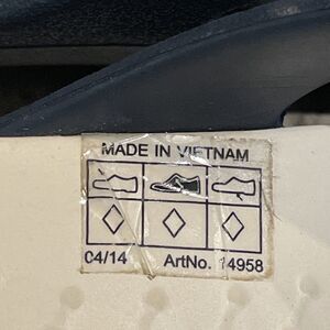 Sanrah Circle Slide Sandal, shoes in navy blue with a cream footbed and a beveled circle embellishment by Crocs in a women's size 7. Art no. 14958. Slip-on, open toes style. Constructed from Croslite material, providing lightweight cushioning and durability. Shoes are very clean and have little to no signs of use. In great pre-owned condition.