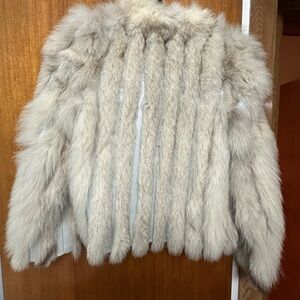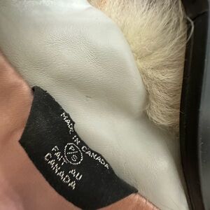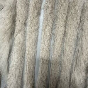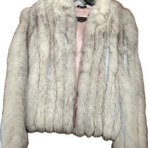 Absolutely stunning! Stay warm and stylish with this elegant cream fur coat. Perfect for any occasion, this jacket adds a touch of luxury to your wardrobe. The coat features a smooth, pink or blush-colored satin lining and light cream/blue leather underneath fur. Measurements in photos. Original Owner. Made in Canada.