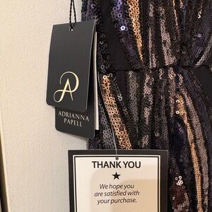 Dazzle in this Adrianna Papell maxi dress. Features a striking black and gold sequin design. Perfect for glamorous events.