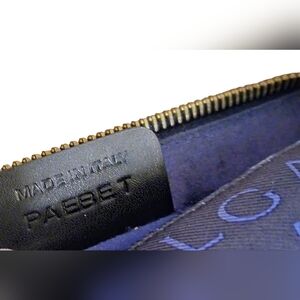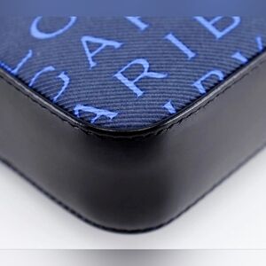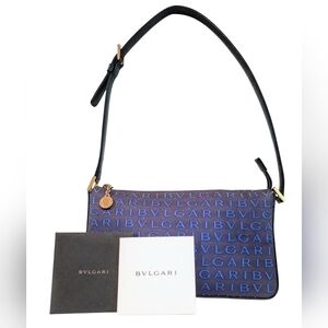 Genuine BVLGARI product with high-quality craftsmanship. This stylish bag is crafted from a combination of nylon canvas and leather in a navy color with gold toned hardware and black leather trim. It features a zipper closure with the brands logo on the zipper pull, adjustable leather shoulder strap, one interior pocket with a snap button closure, and comes with the bvlgari care card. The bag is made in Italy and is part of the Bvlgari brand's Logomania line.