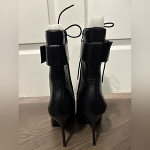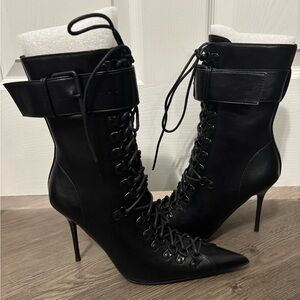 These boots have a vegan leather construction, a pointed toe design, stiletto heels, adjustable buckle closures, front lace-ups, and side zipper closures.