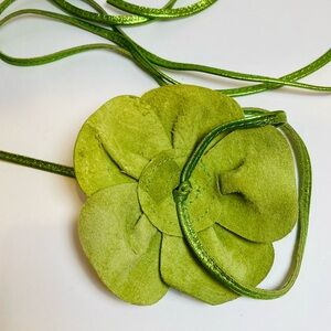 Beautiful rare metallic green leather flower blossom belt with a shimmering finish. Perfect for adding a vintage touch. This belt is vintage there is some wear, on the back of flower blossom see pics all threading is secure overall belt is in good condition.
