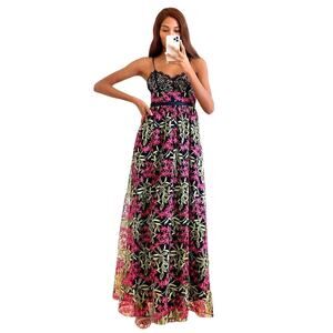 Experience an enchanting evening in the Divine Delight Black Floral Embroidered Maxi Dress, a Lulus Exclusive! The gown features a princess-seamed bodice in black eyelash lace, set against nude lining for an elegant touch. The cascading maxi skirt showcases black mesh adorned with vibrant purple and green floral embroidery, creating a chic and captivating contrast. A black grosgrain ribbon enhances the waistline, ensuring a flattering fit. Adjustable skinny straps provide a customizable touch, and the hidden back zipper/clasp adds convenience. Fully lined for comfort, the dress is crafted from 100% polyester (self and lining) and features a contrast of 55% cotton and 45% nylon.