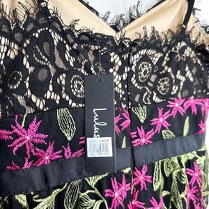 Lulu’s NEW Divine Delight Floral Embroidered Lace Maxi Dress Black Pink Green XS