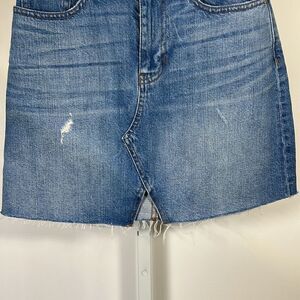 Vintage retro vibe. Zip front with button closure. Five pocket design. Belt loops. 100% cotton. Cutout detail. Mini. Frayed hem. Raw hem. Light distressing throughout. Old school. Flea market inspired. Casual. Jean skirt. Bin J