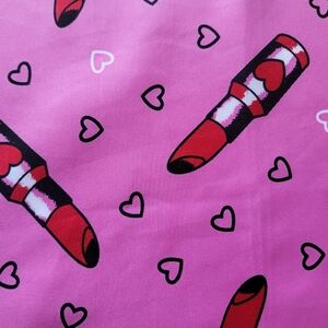 Girly pink square scarf with lipstick and hearts print. Wear it as a head scarf, bandana, or tied around your purse strap!