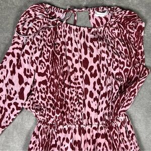Description- pink and like a burgundy in color. Leopard print. Slit in front. One long sleeve, one sleeveless. Open back, with tie.