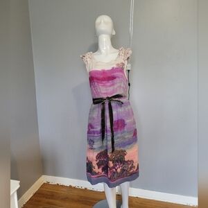 Floral embroidered yoke and Western style piping on a sleeveless dress with full circle skirt and button placket at centre front. Belted and zips in back. Has pockets.