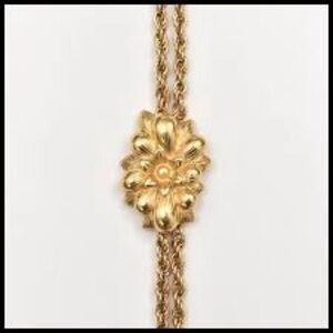 Victorian inspired gold tone flower necklace. The flower slide remains in a fixed position. Adjustable hook clasp closure.
