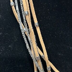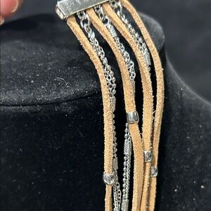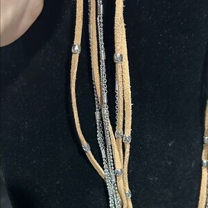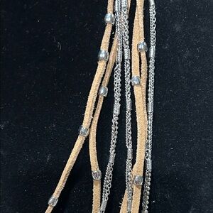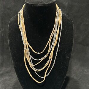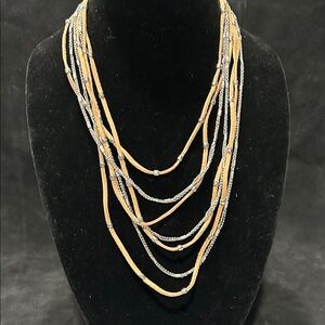 Stylish layered necklace with gold and silver strands. Adds elegance to any outfit.