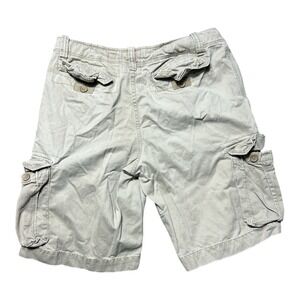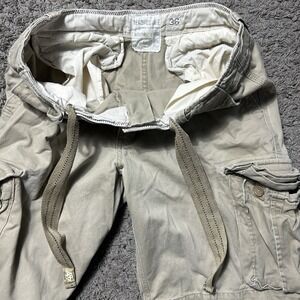 The product is a pair of vintage Y2K cargo military shorts by Aeropostale in a utility style. These tan shorts have a relaxed fit and a zip closure with a drawstring for added comfort and style. Made of cotton, they feature a flat front design with pockets for added functionality. Perfect for men looking for a classic and versatile addition to their wardrobe, these shorts offer the convenience of easy care and a timeless cargo aesthetic.