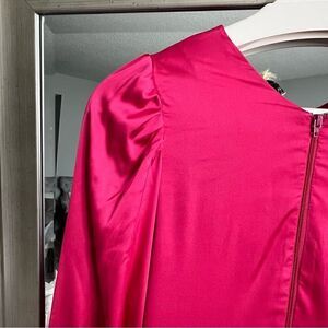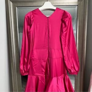 The dress is a deep pink fuchsia with a bold V-neckline and slightly gathered shoulders. Long, billowy sleeves end in subtle cuffs. A defined waist leads to a tiered, ruffled floor-length skirt, crafted from lightweight, slightly shiny fabric, exuding elegance and graceful movement.đЎâ¨
