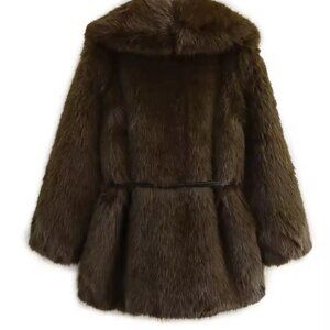 Women's Faux Fur Coat belted shaggy coat- chocolate Brown