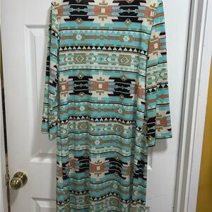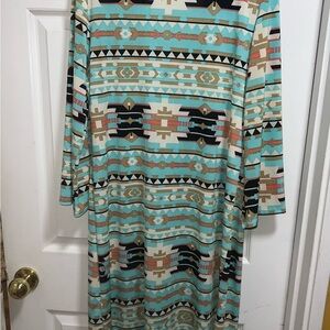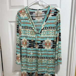 Stylish tribal print dress with a V-neck design. Features a mix of turquoise, black, and tan colors. Perfect for casual outings. Pre-owned Size 1XL