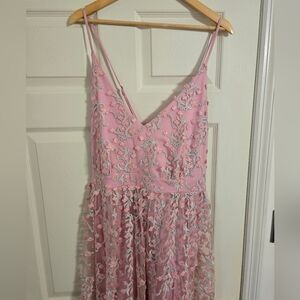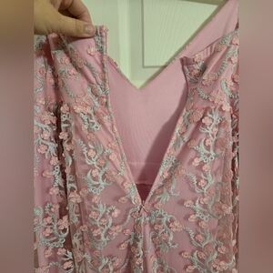 Charming soft pink dress with delicate floral lace details. Ideal for elegant events.