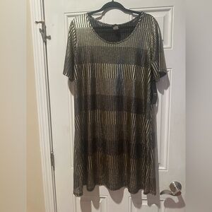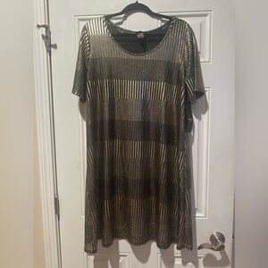 Chic midi dress with black and gold stripes. Short sleeves. Perfect for any occasion.