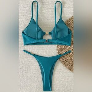 Sexy Teal Gold Ring Details High Cut Thong Bikini Set
