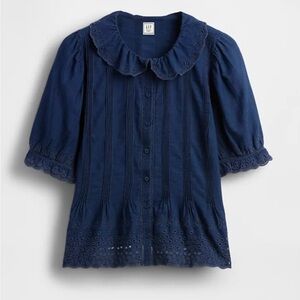 Elegant navy blue blouse with delicate lace details. Perfect for any occasion.