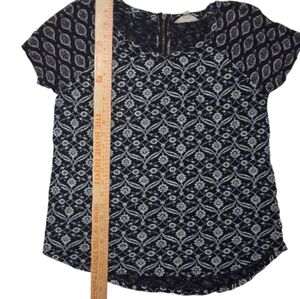 EUC Lucky Brand Sz. M/M Blue/White Floral Short Sleeve Pullover Top. The top has a scoop neckline and a zipper at the neckline in the back. Turn garment inside out. Machine wash cold. Use only mild soap delicate cycle. Do not bleach. Tumblr dry low. Cool iron. Do not dry clean. No flaws noted.