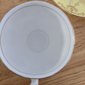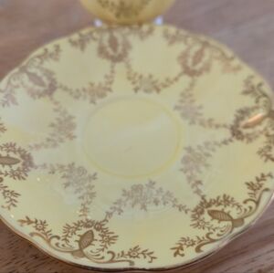 Elevate your tea service with this stunning Queen Anne Fine Bone China set. Made in England, this vintage duo features a soft pale butter yellow backdrop overlaid with an intricate gold gilt filigree pattern. The footed cup and scrolled handle provide a classic Regencycore silhouette, making it a centerpiece for any Grandmillennial collection.
