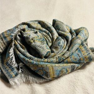Elegant Pashmina -Blue and Gold Patterned Scarf