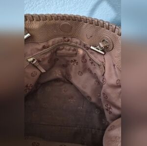 Condition: Pre-owned with notable wear to the shoulder straps, including slight peeling and cracking. The interior shows light signs of use, including a small ink mark near a grommet. Please refer to photos for full condition details.
