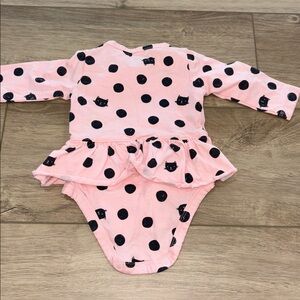 Charming pink bodysuit with black polka dots. Features a cute ruffle detail. Ideal for everyday wear.