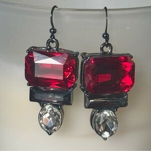 Sophisticated statement earrings featuring richly faceted ruby-red crystals set in a sleek gunmetal frame, finished with a luminous clear teardrop crystal. The geometric silhouette evokes classic Art Deco elegance with a modern, couture-inspired edge.