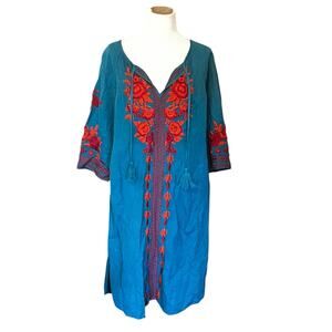 Amazing kaftan dress. M. Gorgeous turquoise/teal color. Heavily and well embroidered. Tassel tie. Pockets. Very high quality piece. Lightly worn.
