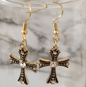 These elegant gold cross earrings add a touch of sophistication to any outfit. Perfect for any occasion.