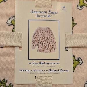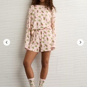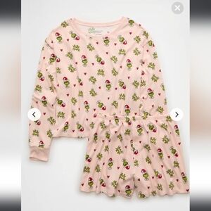 Adorable girls / womens lounge set by American Eagle Outfitters. Features a playful pink design with the Grinch. Perfect for cozy days.