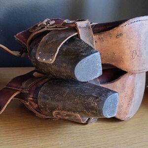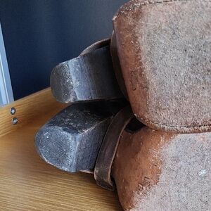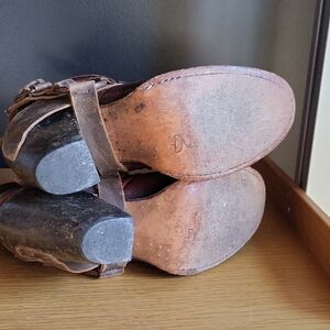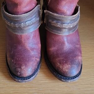 Stylish ankle boots with buckle and strap details. Rich red and brown leather. Perfect for a bold look. A little too small for me or I'd keep them forever. Distressing is factory made, awesome condition. Only signs of me wearing them a few times is slight wear to the soles.