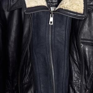 Top Gun men’s leather bomber jacket in black with a soft sherpa double collar and quilted satin lining. Men’s size 3XL. The heavy leather body, structured shoulders, and vintage-style zipper detailing define this heritage look, rugged but with quality. The interior gold lining adds contrast, while the aviator-inspired silhouette nods to 80s era craftsmanship and bikercore attitude.