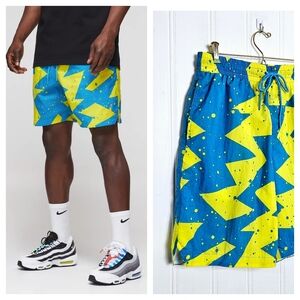 These laser blue & amarillo colorway shorts pair with board shorts, sneakers, slides, tank tops, graphic tees, or oversized hoodies for layered looks.