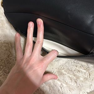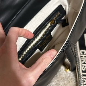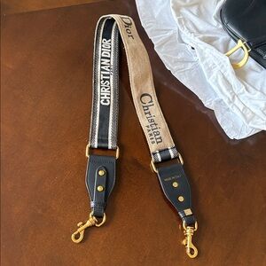 Chic Dior crossbody with a stylish black body. Features a bold tan strap with logo detail. Perfect for versatile wear.