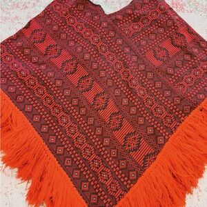 Stylish poncho featuring a red and black pattern. Accented with vibrant red fringe. In perfect condition with no flaws, rips or tears! comment if you have any further questions! ( Any flaws will be pictured )