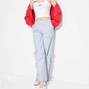 Stylish light blue pants with vertical stripes. Features side tie details. Perfect for casual outings.