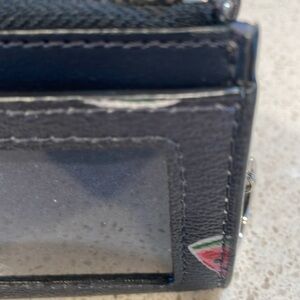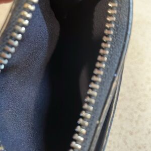 Black card holder with silver keyring, ID slot & card slots. Zip interior pocket. 1 mark on rear. 3x4.5